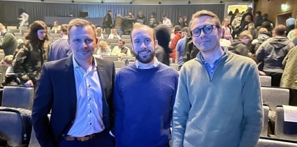 From left: Bernhard Fog, Department Manager at Kongsberg Defence & Aerospace's Moss division, Simen Nord, Mayor of Moss, and Geir Malmedal, Managing Director and Advisor at Driv – Recruitment and Consulting. "Simen and I may not be youngsters, but we were still excited," remarked Geir Malmedal.