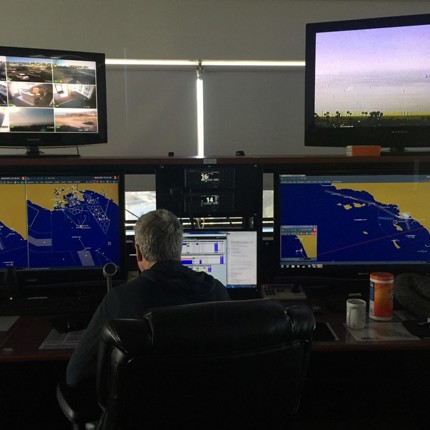 Surveillance in the ports of Los Angeles and Long Beach works like an airport control tower, but for ships. Twenty Marine Exchange employees work round the clock, together with US Coast Guard watchstanders, to prevent accidents and secure a safe, secure, efficient, and environmentally sound maritime transportation system for the Ports of Los Angeles and Long Beach, and all of Southern California.