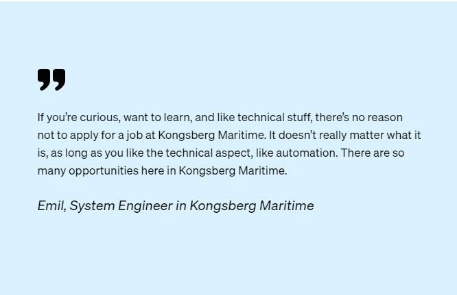 You can explore our employee stories, videos, and social media channels to get a glimpse of life at Kongsberg Maritime. We encourage you to check out our Carrers page section and follow us on LinkedIn or Instagram for more insights.