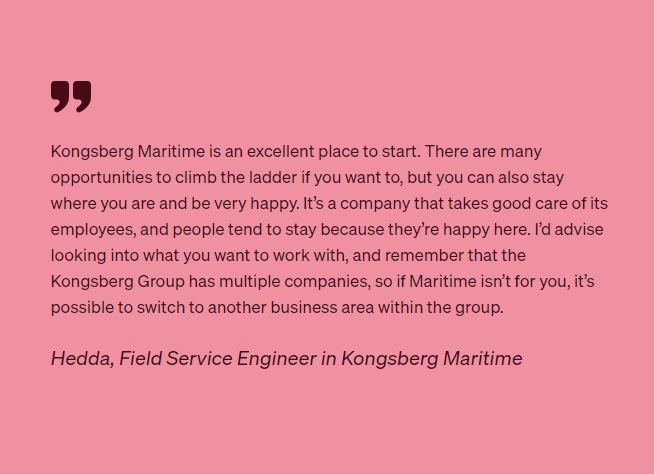 - Discover how Hedda found her path at Kongsberg Maritime. Initially aiming for a career in medicine, Hedda embraced engineering and now travels the world as a Field Service Engineer. Read her story to learn how she overcame new challenges and found excitement in her role.