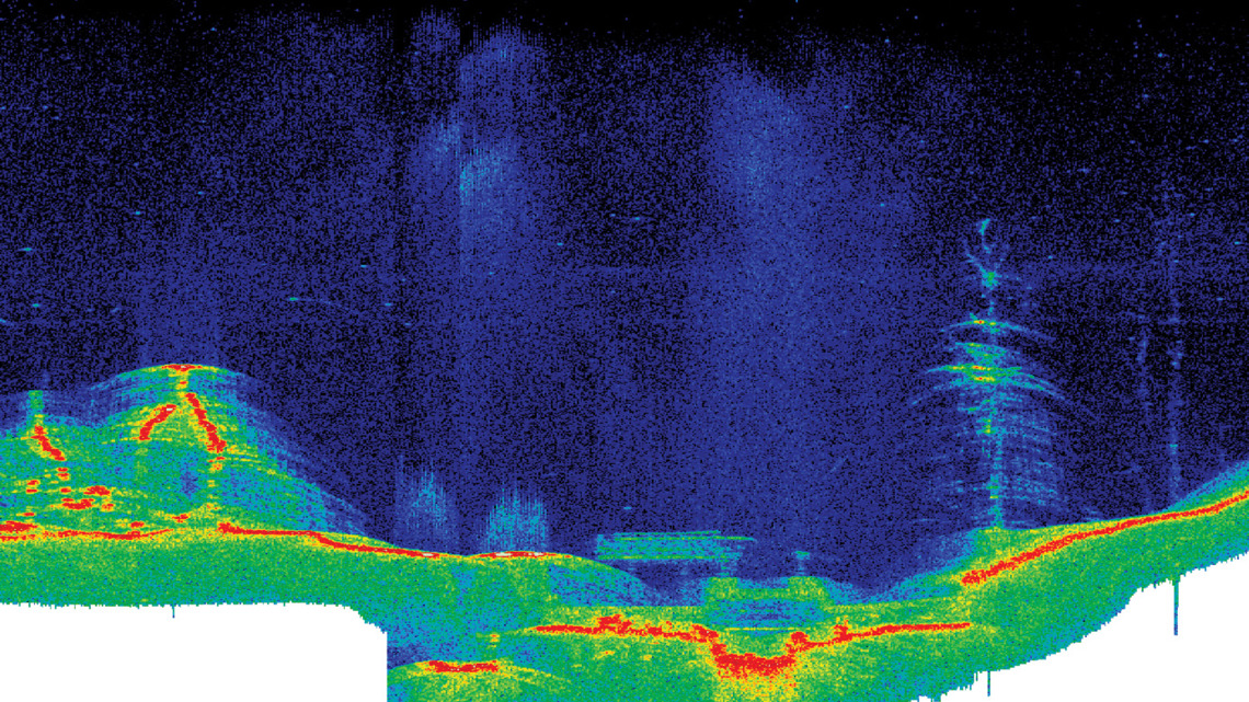 "Watercolumn showing submerged housing and trees at 50 m depth at Guerledan Lake, France", submitted by Ensta-Bretagne. Product: EM2040C MKII.