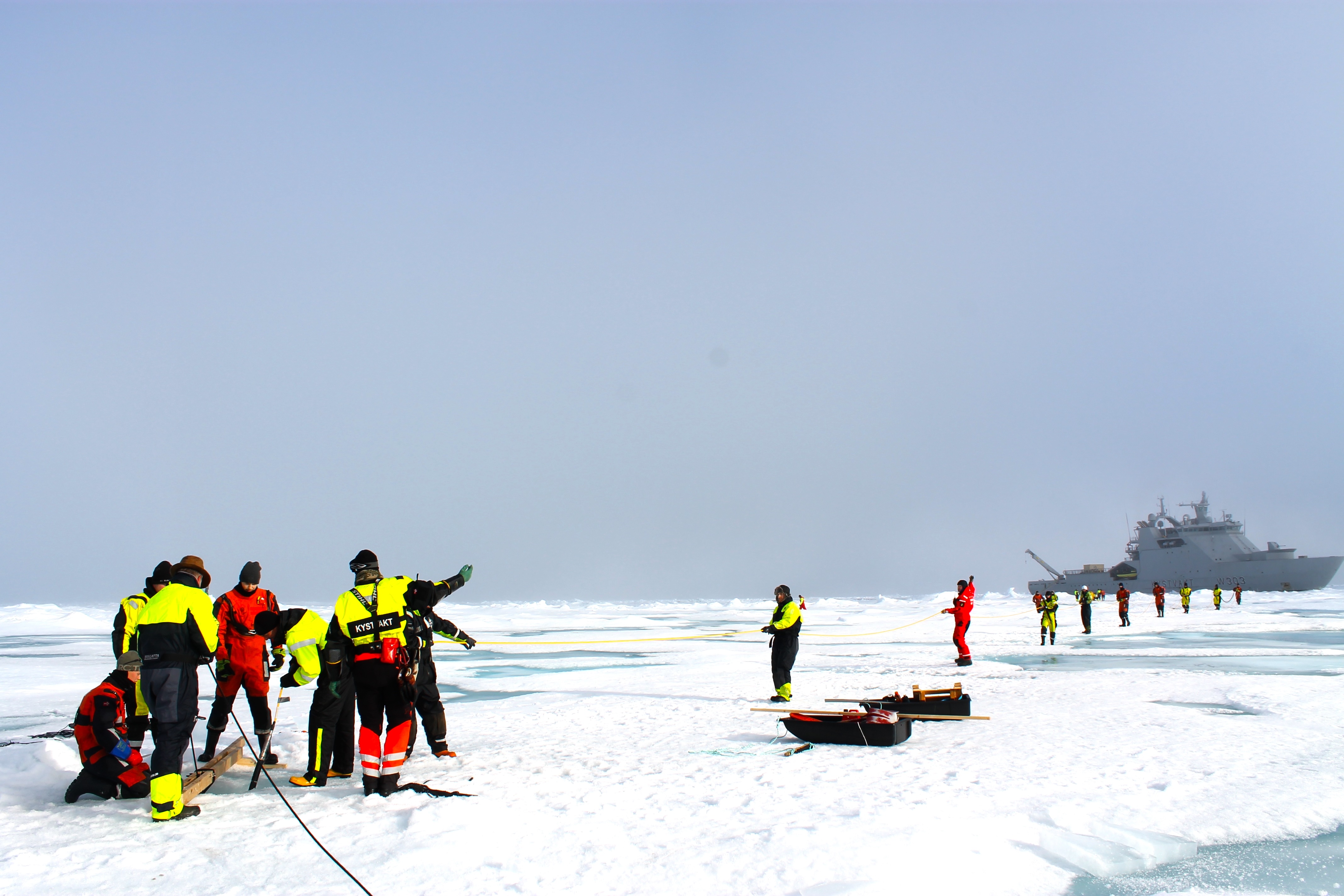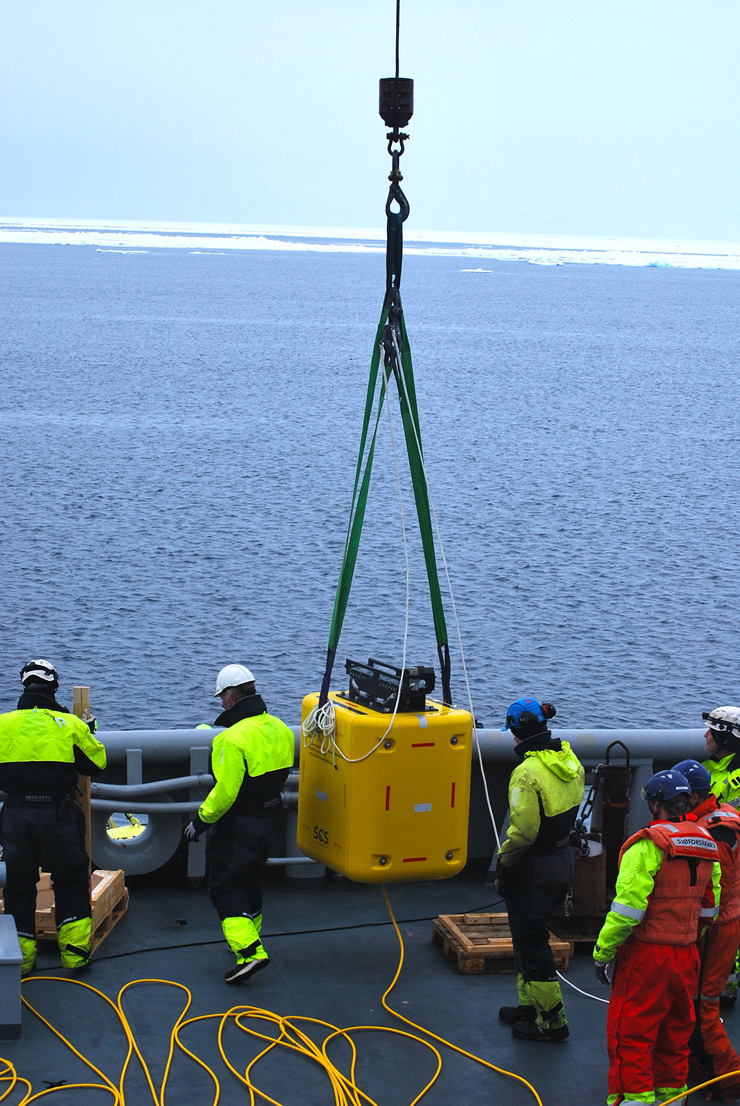 Originally, the plan was to lower the buoy directly from the vessel, but melting or cracking ice made that approach risky. Instead, Christoffer and Terje designed and built a makeshift sled to haul the system 400 metres across the ice by hand.