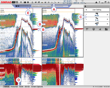 It contains tabs to control the echogram presentations, as well as time and date information.