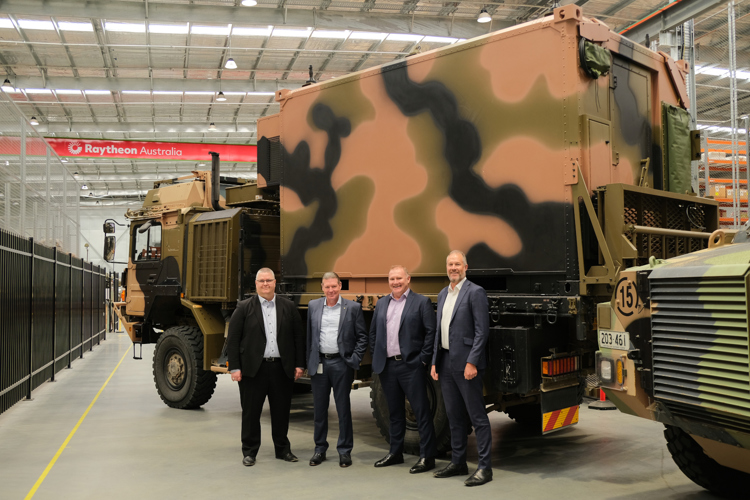 Kjetil Myhra, Executive Vice President Defence Systems Kongsberg Defence & Aerospace, Michael Ward, Managing Director Raytheon Australia, Scott McRae, General Manager Joint Battlespace Systems Raytheon Australia and John Fry, General Manager Kongsberg Defence Australia in front of a Fire Distribution Centre mounted on a HX40M vehicle at Raytheon Australia’s Centre for Joint Integration