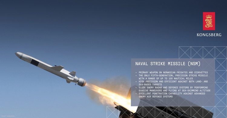 The Naval Strike Missile is a fifth-generation missile with a low radar signature for use in sea-to-sea or sea-to-land defence. The missile, with its superior performance, can go up against well-defended targets with the ability to penetrate the most advanced air defence.