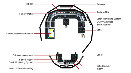 - Fully equipped training environment with advanced hydrodynamic simulation of vessel and fishing gear behaviour