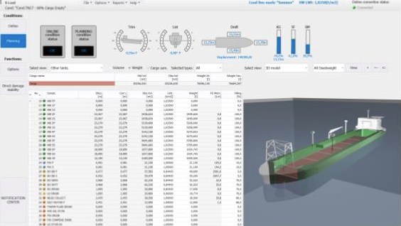 • Basic Version: Includes intact stability control, deck load calculations, ballast simulation, crane modeling, and a 3D floating position view.