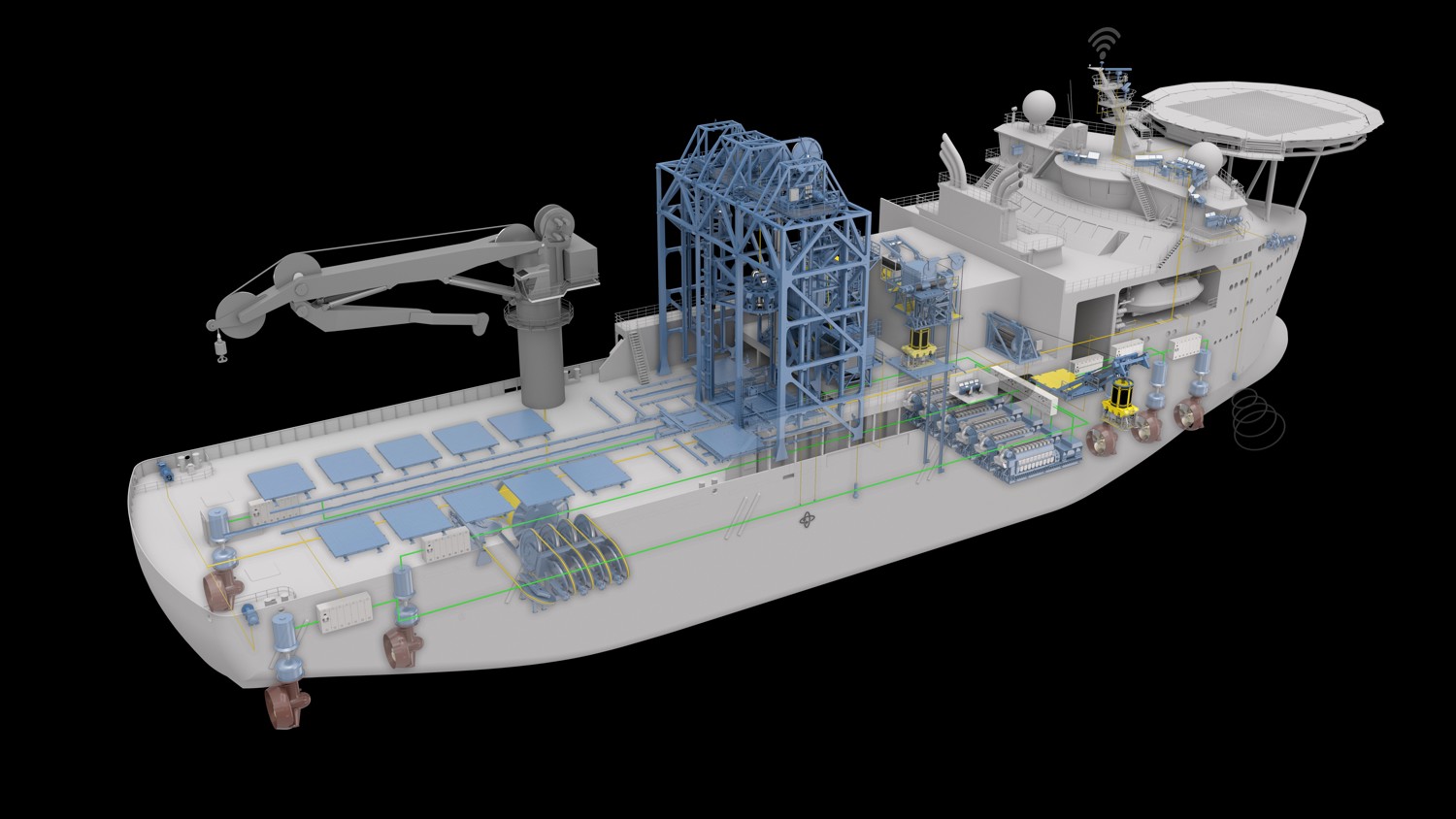 A 3D rendering shows an offshore construction vessel design sitting still in calm seas with blue skies
