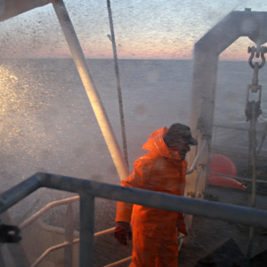 Although this season has been good for cod fishing, it does not appear that we have brought fishing fortune. Oddvar estimates the first catch to be around 2.5 tons. The echosounder shows that the cod are swimming closer to the surface than usual, but nobody can understand why. The VHF radio onboard is used frequently to communicate with other boats nearby and to find out if there is more fish to be found in other areas. The Danish seine is cast in a new area, but the result is even poorer than before, with just under 2 tons. While the crew of five has started gutting the fish below deck, dusk starts to fall. At 15.57 precisely, the sun disappears into the sea. The calm, mirror-like seas have now whipped up into white-topped waves. As the radio persists in forecasting weather conditions, Oddvar has decided that he may as well turn it off. Although the day is almost over and the wind is rising, he has decided to cast out the Danish seine for a third time – and finally gets a satisfactory result.