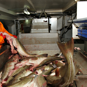 Once the nets are cast, all they have to do is wait. After an hour, the two rope winches start to draw closer together, a sign that the net has reached the seabed and that it is time to haul it in. The movement of the net chases the fish in towards the net opening. After a while, the net appears on the water’s surface and is hauled up onto deck. It has a large mesh to allow smaller fish to escape. Large, fat cod tumble out and down a shaft on the deck, all the way to the bottom of the boat where they will be gutted. ” It’s the big fish we’re after. They’re the ones that bring in the money. We get a much better price per kilo for them,” explains Oddvar, judging by eye that the largest fish from today’s catch will provide 7-8 kilos of gutted fish.