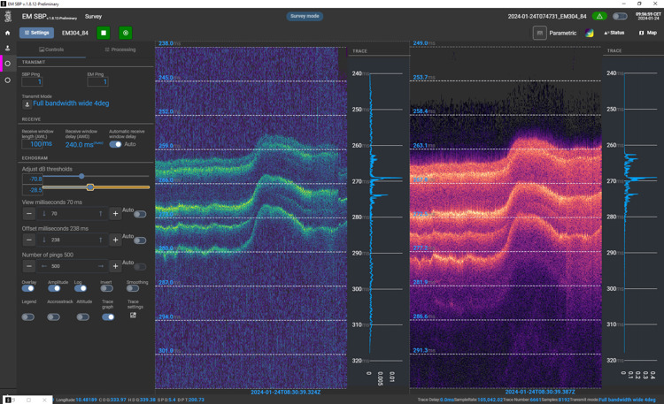 The performance of the sub-bottom data depends on the applied MBES frequency range and configuration. EM®SBP generates sub-bottom signals from the primary multibeam frequencies, as well as parametric low-frequency signals. The software handles, processes and images the primary and parametric signals simultaneously.