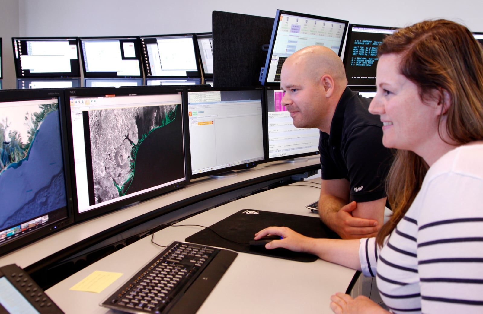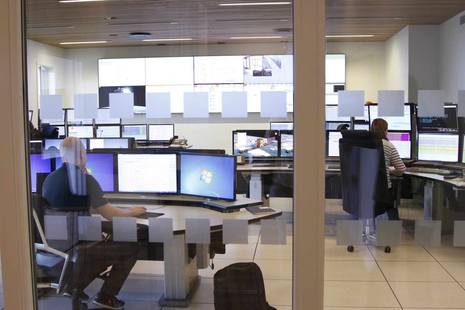 One wall is covered in large flat screens. These display the movement of and data from 70 satellites out in space. In front of the wall of screens are three rows of desks. The desks have a number of monitors which the production engineers use to collate and analyse the data.