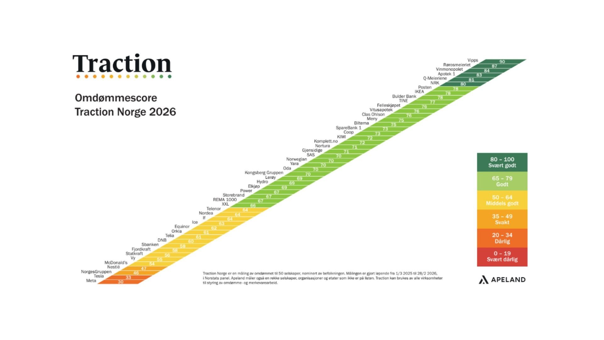 Traction Norway is a nationwide perception survey covering 50 companies, selected through a nomination process involving the Norwegian population. The survey is conducted by Norstat, which has a panel of more than 100,000 respondents. Companies are evaluated on factors such as quality, leadership, ethics, climate impact and innovation.