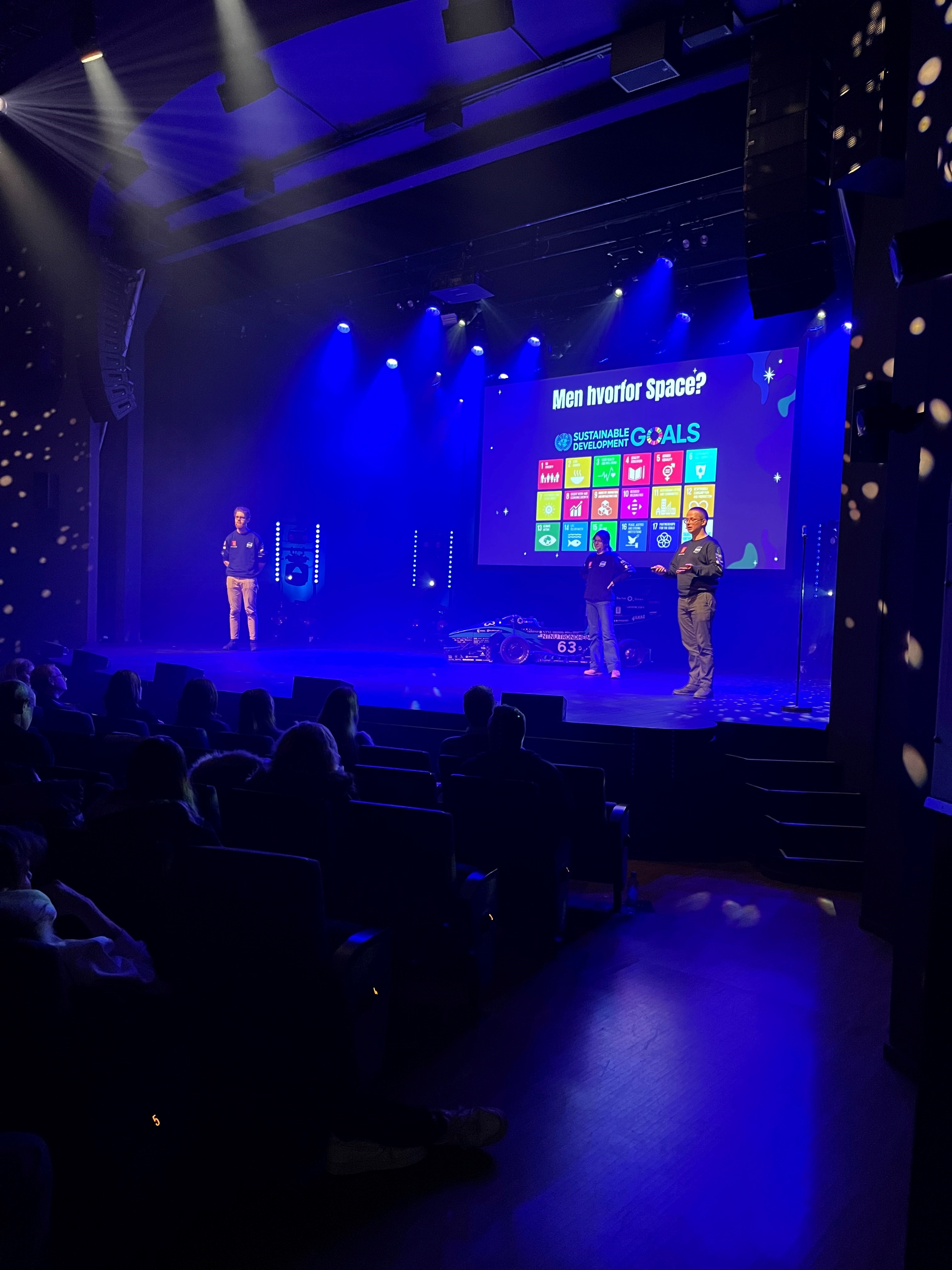 Onstage, we showcased presentations from student projects at NTNU, with whom Kongsberg Defence & Aerospace collaborates, to the enthusiastic response of the students. Up first was Revolve NTNU, which annually builds a four-wheel-drive electric race car and competes in Formula Student competitions across Europe. On the large screen, the students watched one of the previous cars as it traversed “Trollstigen” in the West of Norway. The car itself was revealed in a dramatic display featuring lights, music, and smoke effects.