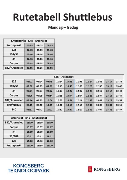 Bussen vil følge en fast rute som knytter sammen Kongsberg Defence & Aerospace til knutepunktet - Kongsberg Næringspark (K45) - Arsenalet. Utforsk rutetabellene nedenfor for nøyaktige tidspunkter og steder.