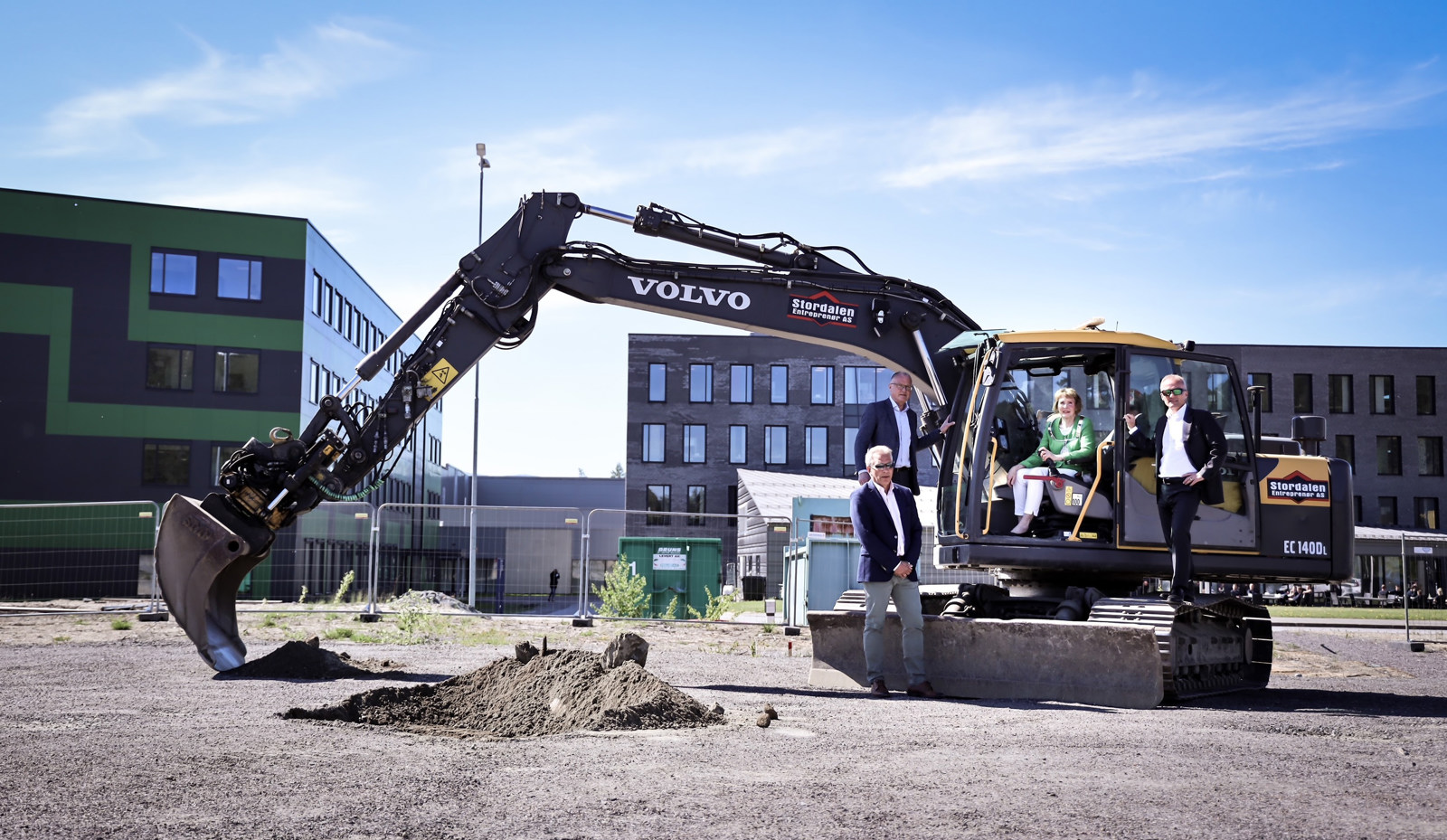 The traditional shovel had been replaced by a large excavator. Before climbing into the large machine, Mayor Kari Anne Sand, pointed out that she was probably not qualified to use an excavator, so people should take a step back just in case.