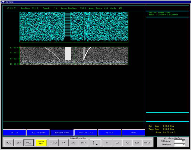 An advantage of stimulating the hydrophone output of real sonars is that the operator is using real equipment to analyse the target’s acoustic signature. The PROTEUS Passive Sonar Simulator builds operator skills by using their actual on-board displays, HMI, and analysis software tools. As known sounds are used to stimulate the hydrophone output, system noise appears to be as in a live tracking situation.