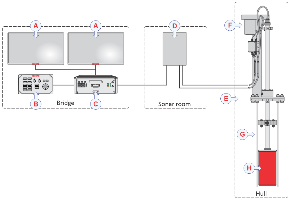 The Simrad SY50 system units are typically installed on the bridge and in a sonar room. The main communication line between the bridge units and the Power Supply Unit in the sonar room is a high-speed Ethernet cable. The Simrad SY50 fish-finding sonar comprises the following units: