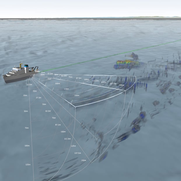 The MS70 provides an acoustic matrix of 500 beams (25 horizontal and 20 vertical). This enables the MS70 to provide instantaneous 3D volume data. Where other systems need multiple pings to provide 3D volume data, the MS70 can use a single ping. This allows the MS70 to provide more accurate data. For example, a school of fish can change its structure several times during the time other systems need to cover the school.