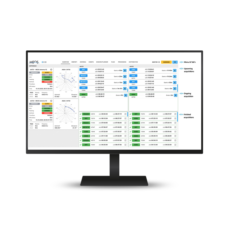 MEOS Connect integrates geographically distributed ground stations into a network with uniform monitoring and control capability. The benefits are improved availability and less operational cost compared to traditional systems